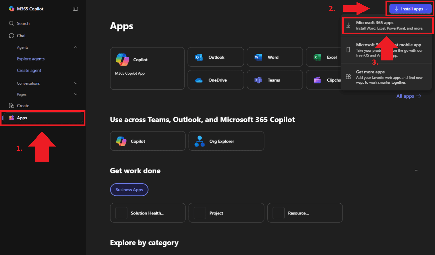 Næst smellið á „Apps“, síðan smellið á „Install apps“ og þar undir smellið „Microsoft 365 apps“.